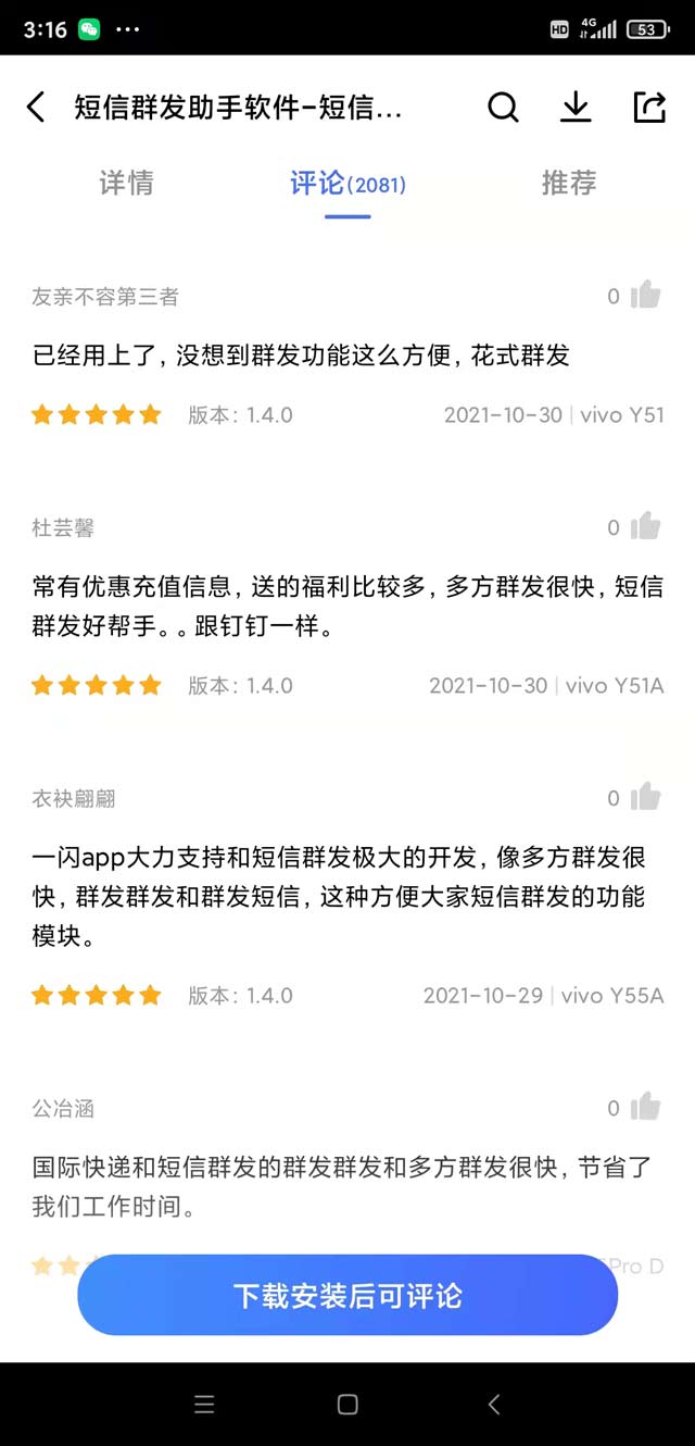 不過(guò)前段時(shí)間我在網(wǎng)上沖浪,偶然發(fā)現(xiàn)了紅楓葉傳媒研發(fā)的短信群發(fā)軟件,不用不知道,一用嚇一跳。它可以一次性給上百個(gè)客戶群發(fā)短信,還能對(duì)客戶進(jìn)行分組,精準(zhǔn)群發(fā)營(yíng)銷內(nèi)容。價(jià)格方面也對(duì)咱們這種小百姓很友好,軟件不到一杯奶茶錢,群發(fā)套餐500條也才36塊錢,分分鐘就能回本。安卓和iOS系統(tǒng)都能使用,我下載的時(shí)候看到他們的下載量都破千萬(wàn)了。用了它之后,飯店的生意就蹭蹭蹭地漲,每天雖然累,但是累得特充實(shí)~